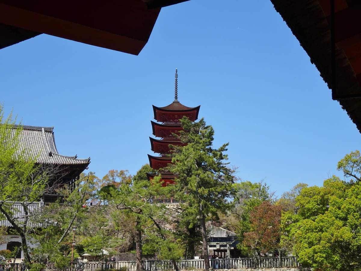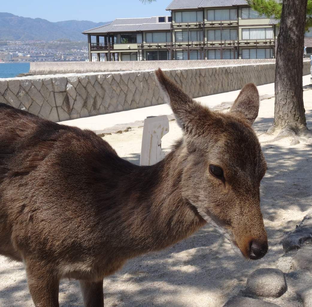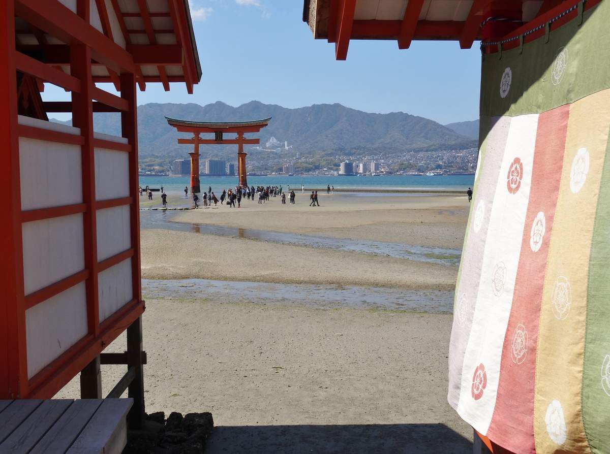 Départ pour Miyajima. L’ensemble du personnel du Ryokan est réuni le long du car pour nous souhaiter un bon voyage. Continuation pour la visite du célèbre torii flottant de Miyajima. Traversée en ferry pour l’île sacrée, considérée comme l’un des trois plus beaux paysages de l’archipel. L'île d'Itsukushima est considérée, dans la religion shintoïste, comme une île sacrée. Il n'y a ainsi ni maternité ni cimetière sur l'île, car son statut interdit que l'on y naisse ou que l'on y meure. De la même façon, il est interdit d'y abattre des arbres. L'île est donc couverte d'une forêt relativement luxuriante. La mer intérieure du Japon ressemble à notre Méditerranée avec ses côtes découpées, ses pinèdes et ses oliviers. Les cerfs viennent chercher des caresses des visiteurs. Visite du sanctuaire rouge vermillon sur pilotis d’Itsukushima, déclaré au Patrimoine Mondial de l’UNESCO